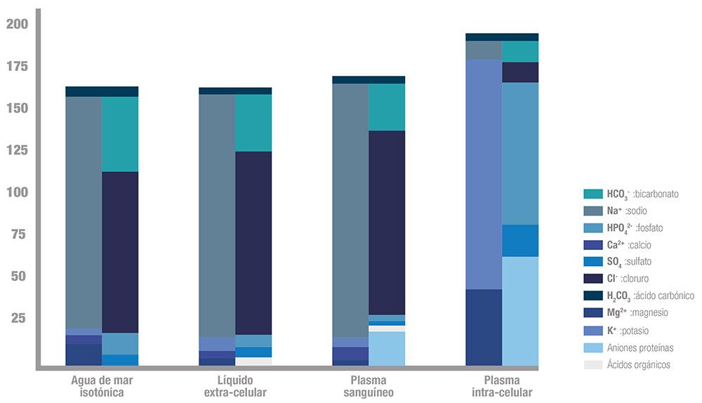 El agua de mar isotónica es líquido extraído del océano cuya salinidad ha sido reducida con agua de manantial, pasando así de una concentración salina aproximada de 33 gramos de sales por litro a 9 gramos por litro. Así, y gracias al protocolo AQP, obtenemos un plasma marino isotónico con una composición mineral prácticamente idéntica a la de nuestros líquidos corporales: lágrimas, sudor, plasma sanguíneo…
